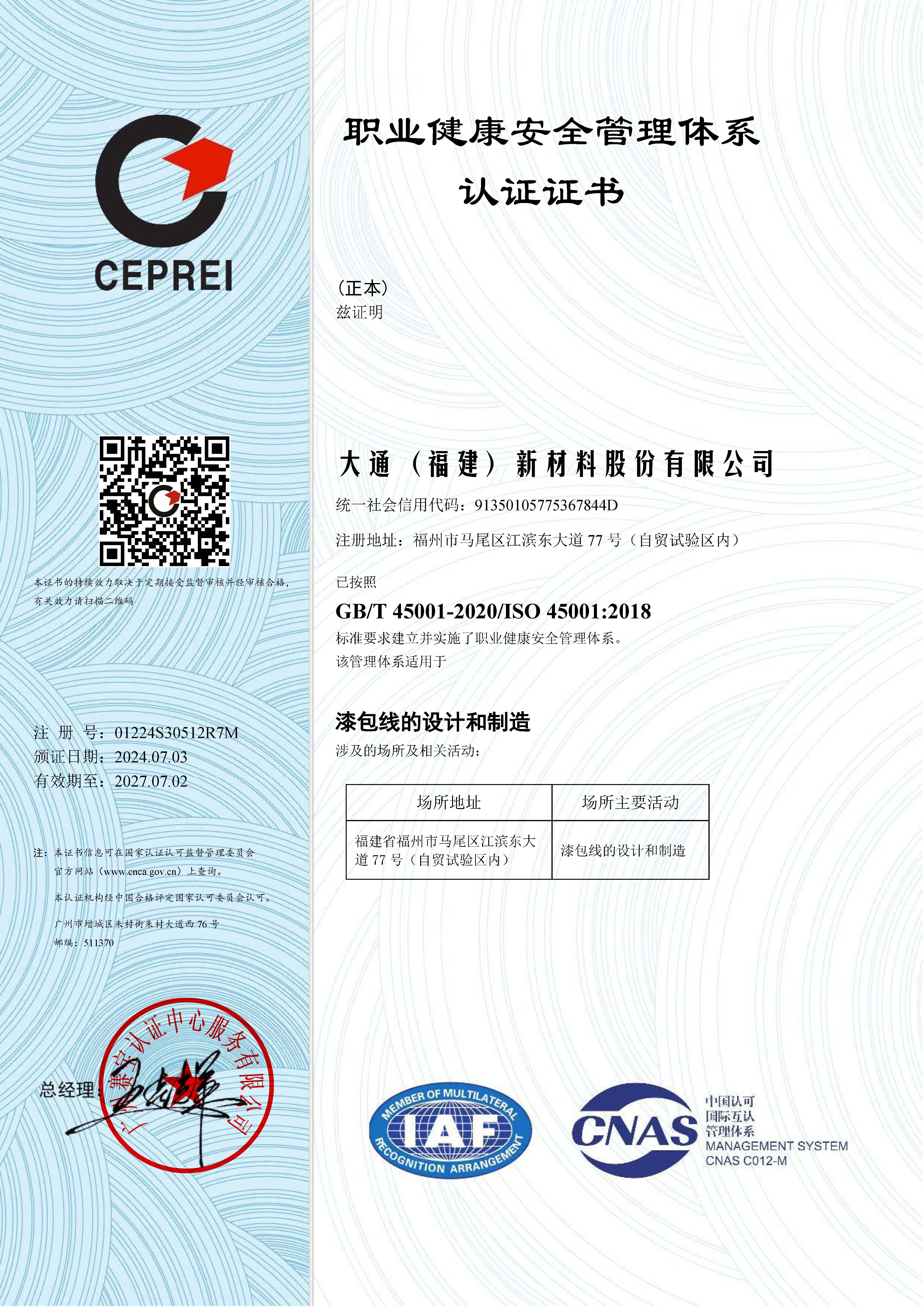 職業(yè)健康安全管理體系認證證書GB/T 45001-2020/ISO 45001:2008