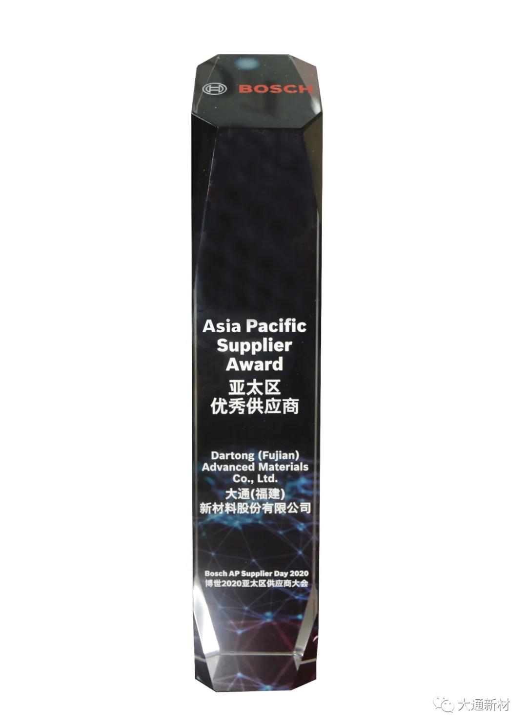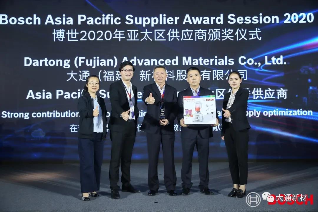 2020年9月17日,德國博世集團2020年亞太區供應商大會在博世上海總部召開。本次會上,大通(福建)新材料股份有限公司再次被評為“博世亞太區優秀供應商”。公司常務副總經理沈明勛出席本次會議并上臺領獎。