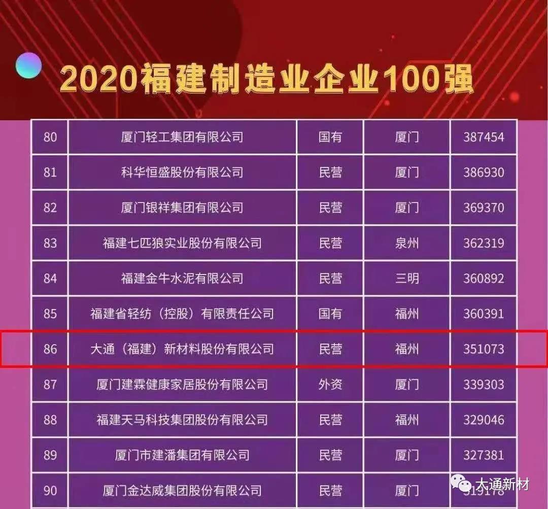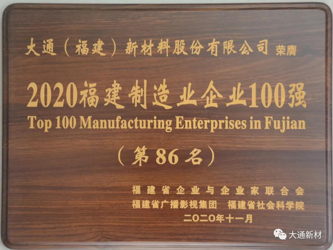 11月21日,2020福建企業(yè)100強(qiáng)發(fā)布大會(huì)暨福建企業(yè)家大講壇在寧德市舉行,會(huì)上權(quán)威發(fā)布“2020福建企業(yè)100強(qiáng)”榜單。大通新材入選“福建制造業(yè)企業(yè)100強(qiáng)”榜單。 大通新材連續(xù)兩年榮登“福建企業(yè)100強(qiáng)”榜單,這不僅是公司綜合實(shí)力的體現(xiàn),也是社會(huì)各界對(duì)企業(yè)的高度認(rèn)可。大通新材作為民營(yíng)制造業(yè)企業(yè)代表之一,始終堅(jiān)持圍繞主業(yè),在疫情、國(guó)內(nèi)經(jīng)濟(jì)壓力增大的復(fù)雜形勢(shì)下,迎難而上、搶抓機(jī)遇、搶占市場(chǎng),堅(jiān)持練就企業(yè)內(nèi)功,增強(qiáng)核心競(jìng)爭(zhēng)力。未來,大通新材將持續(xù)弘揚(yáng)“敢為天下先、愛拼才會(huì)贏”的精神,為福建經(jīng)濟(jì)發(fā)展貢獻(xiàn)一份力量。 據(jù)悉,今年福建百?gòu)?qiáng)企業(yè)評(píng)選對(duì)象包括國(guó)企、民企、外企等各種所有制企業(yè),是一份嚴(yán)謹(jǐn)、科學(xué)、專業(yè)的綜合榜單,也被外界譽(yù)為福建企業(yè)界的“福布斯”排行榜。