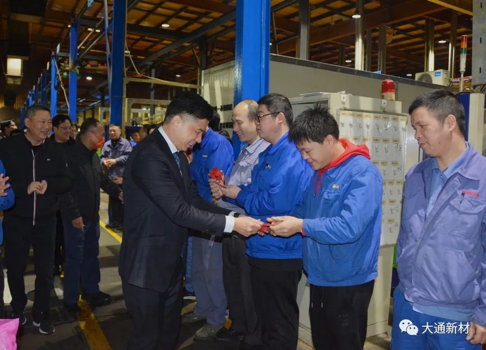 廠區內紅旗飄飄、燈籠高掛,處處洋溢著濃濃的節日氛圍;車間內機器轟鳴聲不絕于耳,生產設備正繁忙而有序地作業。2月1日,農歷大年初一,年味兒正濃。一大早,總經理陳曦率領中高層管理人員,給春節期間依然堅守在一線的員工拜年、加油鼓勁,并送上誠摯祝福和衷心感謝。初一團拜是大通新材多年來堅持的傳統賀歲方式,極大地鼓舞了員工工作熱情,提高了員工生產積極性,增強了企業凝聚力。