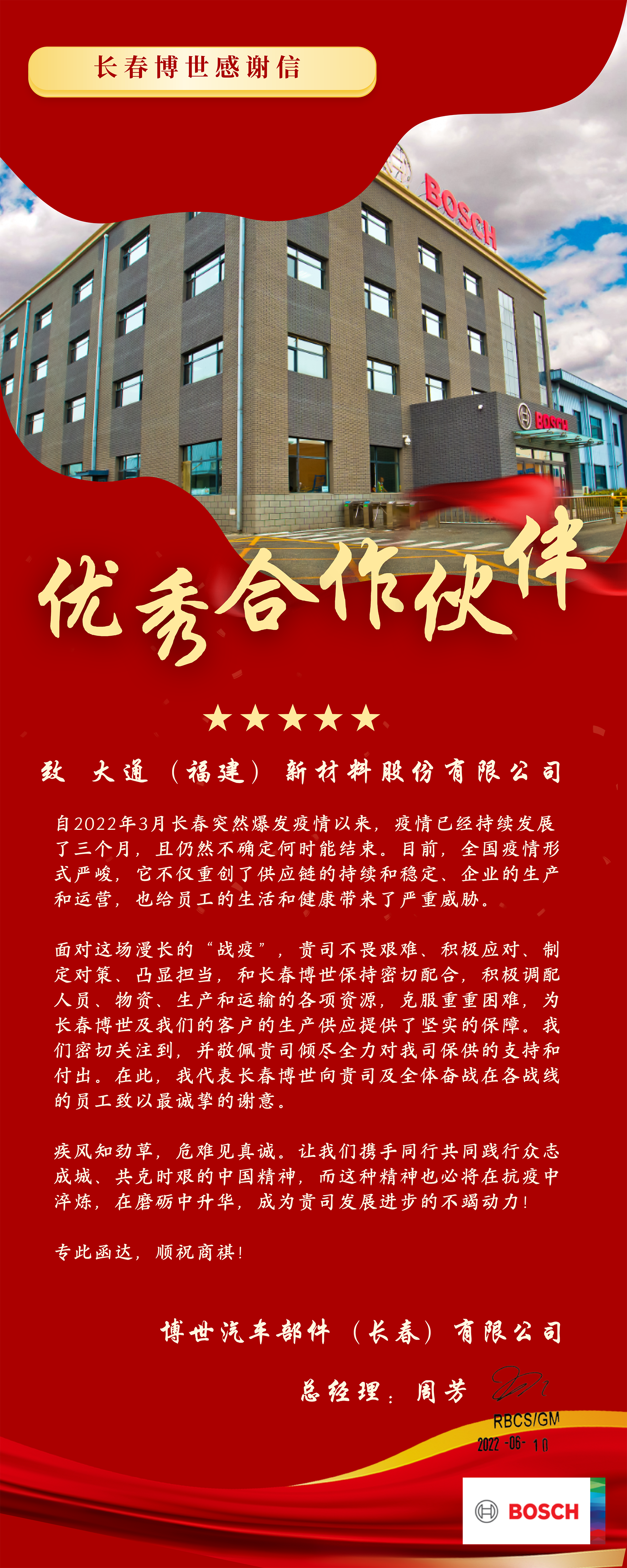 近日,公司收到一封來自博世汽車部件(長春)有限公司的感謝信。信中,長春博世對公司在疫情防控關鍵時期,努力克服重重困難,積極調配各項資源,為其保供所給予的全力支持和付出表達衷心感謝。