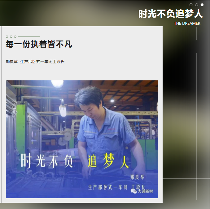 在這春和景明、萬物勃發的美好時節,我們將以“大通新材”公眾號為載體,推出“時光不負追夢人”系列故事,挖掘人物背后的故事,致敬每一個平凡而閃耀的追夢者。本期我們對話臥式一車間的工段長鄭良舉,傾聽他散落在歲月長河里的追夢故事。